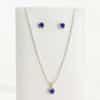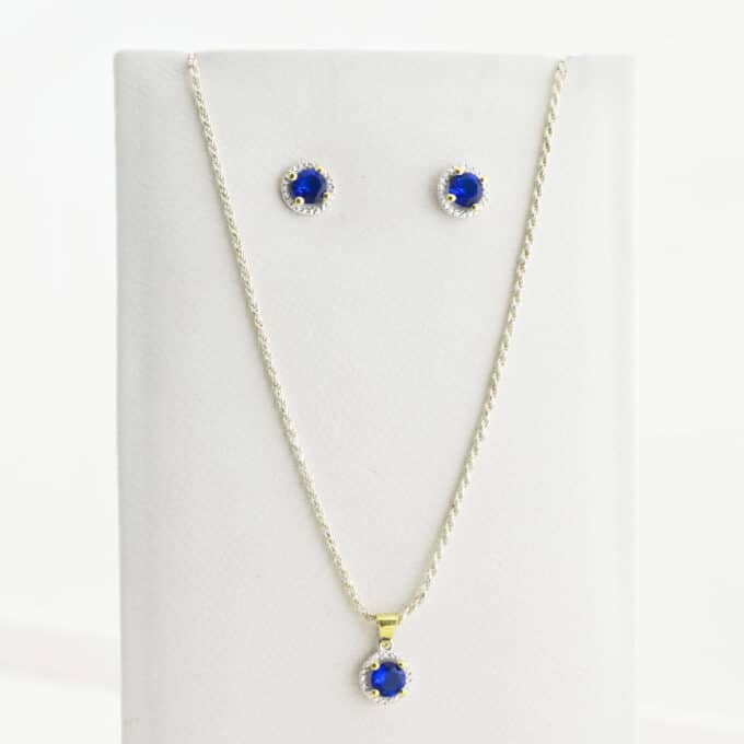 Aretes y collar de plata peruana con detalles de oro 18k, circón azul central y pequeños circones suizos alrededor. Incluye un par de aretes y un collar a juego, ideal para eventos especiales o como regalo inolvidable.