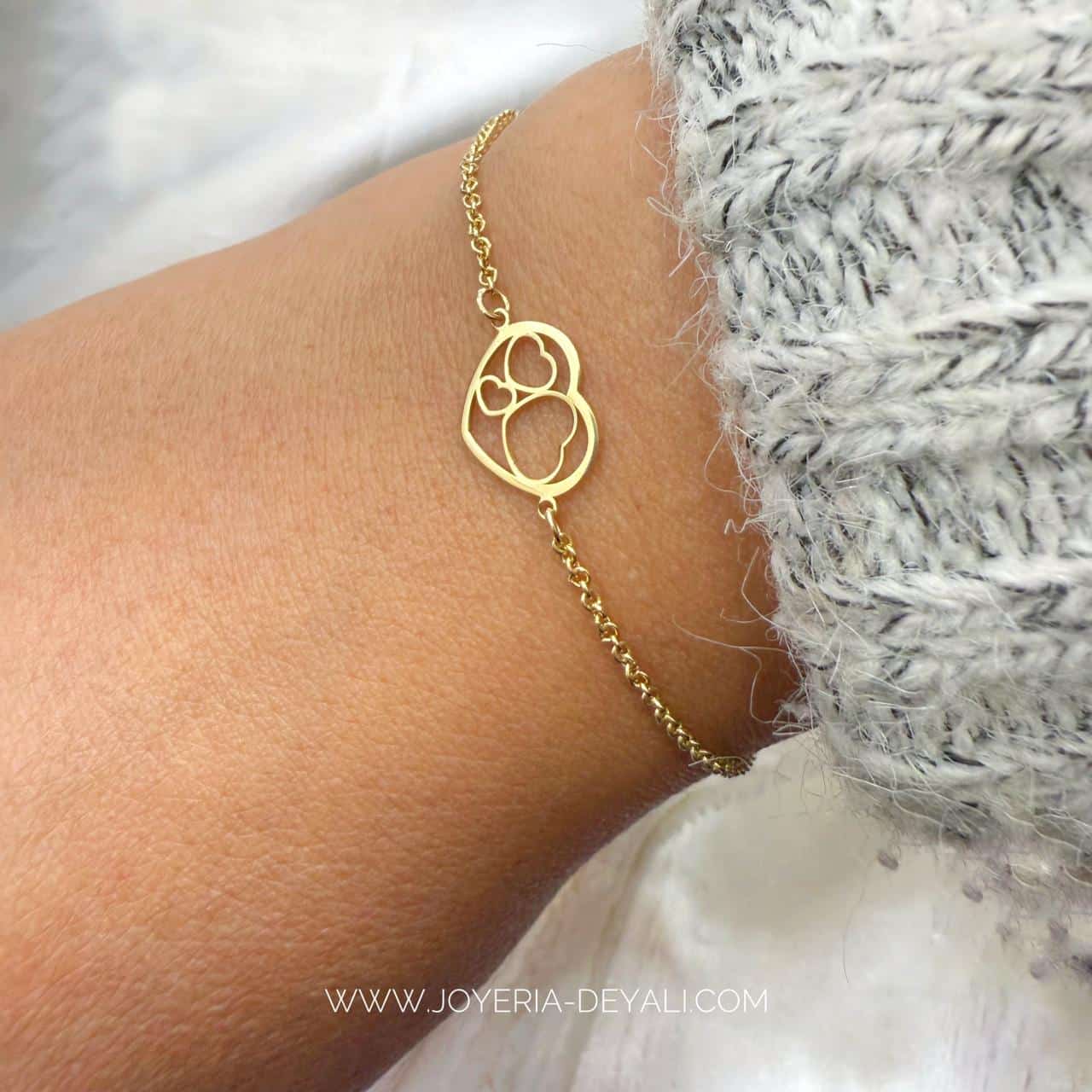 Esta delicada pulsera de oro amarillo 18k presenta un diseño especial de tres corazones unidos, donde un corazón central encierra a otros dos, representando el amor incondicional de la familia. Una pieza cargada de simbolismo, perfecta para celebrar los lazos eternos que nos unen a quienes más amamos.