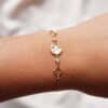 Ideal para usar en ocasiones especiales o como accesorio de lujo diario, esta pulsera con nácar ofrece un equilibrio perfecto entre modernidad y tradición. Forma parte de las pulseras más elegantes del 2025 y es altamente buscada por quienes valoran la calidad artesanal y los detalles exclusivos. Encuentra en esta pieza una joya versátil y sofisticada, perfecta para regalar o para consentirte. Disponible solo en nuestra tienda online, donde cada pieza cuenta una historia de amor, estilo y distinción.