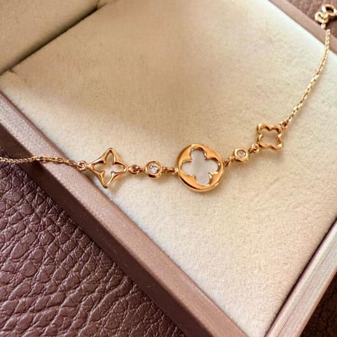 Descubre la elegancia atemporal de nuestra pulsera de oro 18k estilo Van Cleef, una joya sofisticada y femenina que combina lujo, delicadeza y diseño icónico. Confeccionada en oro amarillo de 18 quilates, esta pulsera presenta motivos florales con incrustaciones de nácar natural, evocando armonía, feminidad y buen gusto. Su diseño inspirado en la alta joyería francesa la convierte en una pieza imprescindible dentro de nuestra colección de pulseras para mujer en oro 18k.